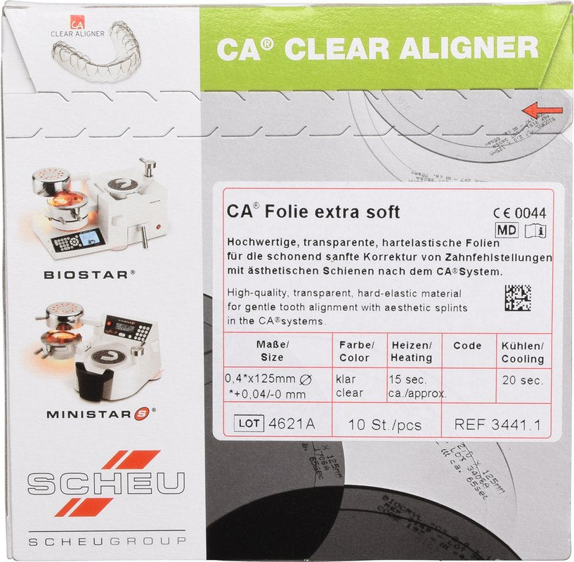 Hochwertige, transparente, hartelastische Folien für die schonend sanfte Korrektur von Zahnfehlstellungen mit ästhetischen Schienen nach dem CA® System. Alle Folien tragen die original CA® Kennzeichnung mit Stärkenangabe: extra soft (0,4 mm), soft (0,5 mm), medium (0,625 mm) und hard (0,75 mm).