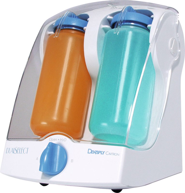 Das DualSelect Spender-System ermöglicht auf einfache Weise die Zufuhr von medikamentösen Lösungen oder reinem Wasser als Spüllösungen für DENTSPLY Cavitron-Systeme.
