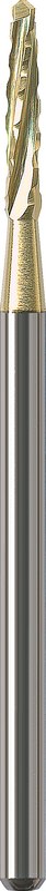 Knochenfräser konisch, zur schonenden Bearbeitung von Knochensubstanz. Die neue optimierte S-Verzahnung gewährleistet einen sehr ruhigen Instrumentenlauf bei höchster Schnittleistung unter maximaler Schonung der zu zerspanenden Knochensubstanz. Durch die Hartbeschichtung mit ZrN (Zirkon-Nitrid) entspricht der Fräser den hohen Anforderungen die bei der chirurgischen Knochenbearbeitung an eine hochwertige Oberfläche gestellt werden. Die Übergangsschneide erlaubt auch ein axiales Eintauchen in die Knochensubstanz. Das neu entwickelte Schneidendesign garantiert ein kontrolliertes Arbeiten sowie eine glattere Knochensubstanz-Oberfläche für eine gute Wundheilung.