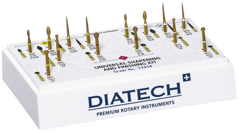 Dieses Finier-Kit besteht aus 8 Multilayer-FG-Diamanten zum Konturieren und 6 Multilayer-FG-Diamanten zum Finieren von Amalgam-, Komposit-, Kompomer-, Keramik-, Glasionomer- und Goldrestaurationen.