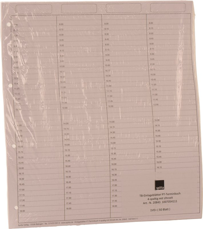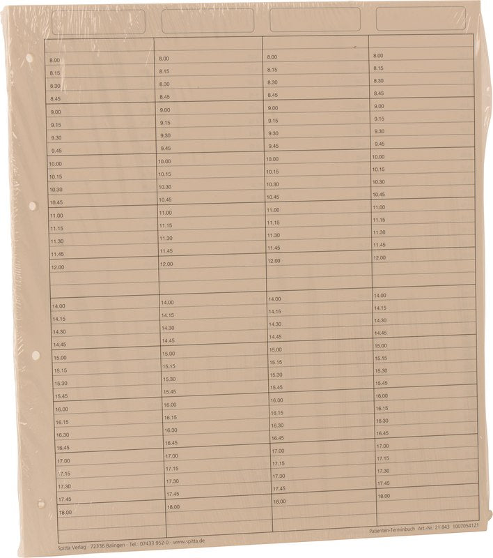 Terminbucheinlagen 4-spaltig mit einem Zeitrhythmus von 15-Minuten sorgen im Praxisablauf von 8.00 – 12.00 und 14–18 Uhr für einen reibungslosen Terminablauf.