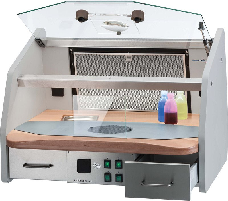 Der ERGORET CC KFO sorgt für gesundheitsschonendes Arbeiten bei der Kunststoffbearbeitung – im kieferorthopädischen sowie im gewerblichen Labor. Schmutz, Staub und Methylmethacrylat-Dämpfe werden großflächig über den integrierten Filter in der Rückwand abgesaugt. Ein zusätzlicher Anschluss für Schmutzabsaugung über Mehrplatz- bzw. Zentralabsaugungen oder die DUSTYAbsauganlagen ist ebenfalls vorhanden. Optional ist der Vario-Hubtisch erhältlich. Serienmäßig ist der ERGORET CC KFO mit einigen Extras ausgerüstet – darunter ein schwenkbarer Glasdeckel mit Lupe, Arbeitsunterlage und Ablageschale, zwei Schubladen, LED-Beleuchtung und zwei Steckdosen. Neben der umfangreichen Ausstattung bietet der Arbeitsplatz außerdem viel Platz für Polymerisate und Dosierflaschen. Hinweis: Bitte sprechen Sie auch Ihre zuständige Behörde zum Thema „Subventionierung von Arbeitsplätzen“ an – es gibt verschiedene Institutionen, bei denen man einen Antrag auf Kostenerstattung für einen höhenverstellbaren Systemarbeitsplatz stellen kann, wie z. B. den ERGORET CC KFO mit Vario-Hubtisch.