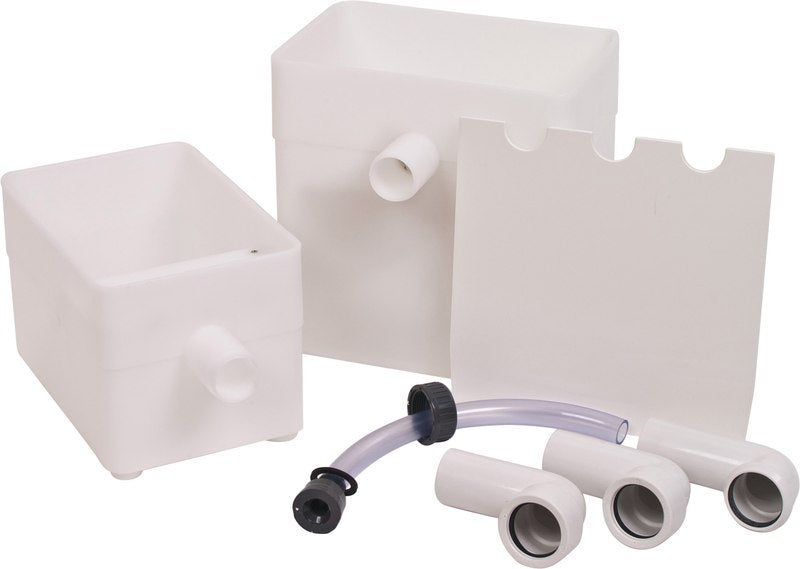 Die Gipsfanganlage aus Vollkunststoff verhindert ein "Zusetzen" der Abflussleitungen mit Gipsschlamm. Der große Behälter mit einer Mittelwand dient als Absatzbecken und wird zur Reinigung herausgenommen. Der kleine Behälter ersetzt den Siphon und dient so als Geruchsverschluss und zusätzlich als Wachsfang.