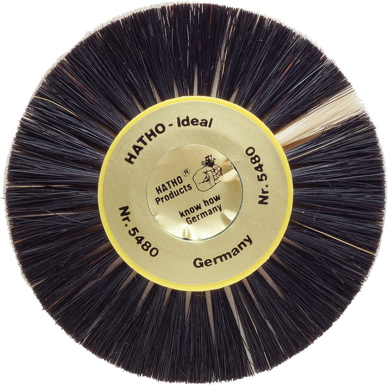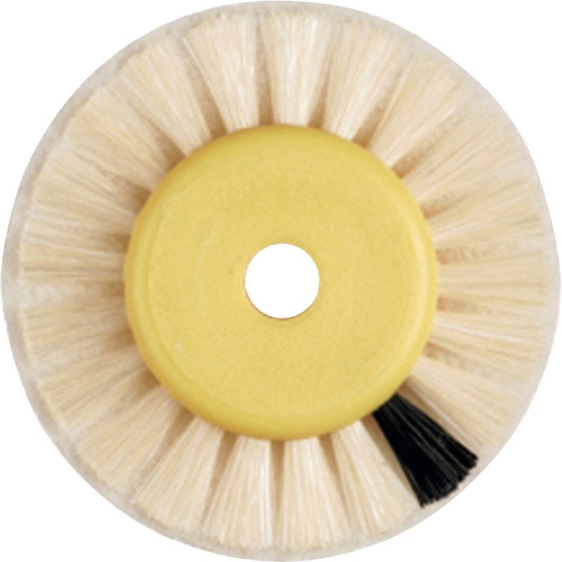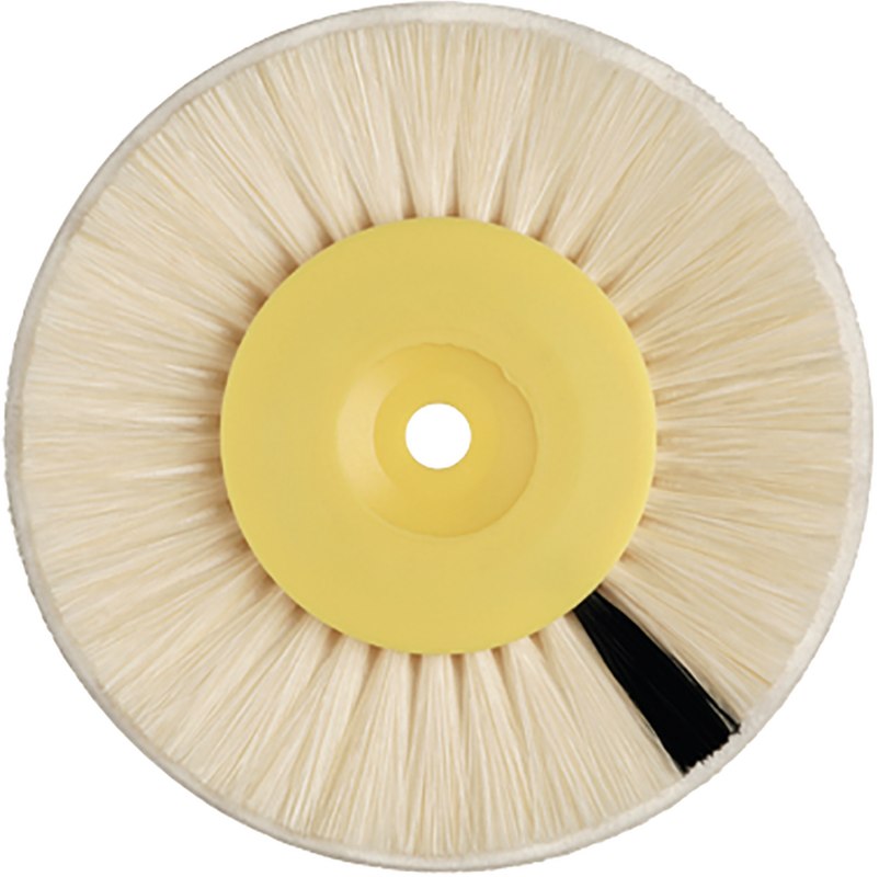 Einlagebürste mit besonderem Besatzmaterial: 2 Reihen weißer Chungking-Borsten umranden ein 1-lagiges weißes Faservlies, welches die Eigenschaft hat, Bimsstein wie ein Schwamm aufzusaugen und dann zusammen mit den Borsten die Kunststoffoberfläche zu polieren.