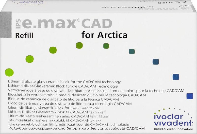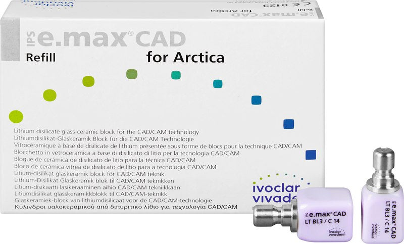 IPS e.max CAD Blöcke für KaVo ARCTICA. Die drei verschiedenen Transluzenzstufen, A–D-, Bleach- sowie Impulse-Farben ermöglichen das Anfertigen von ästhetischen Restaurationen. Patientenindividuelle Charakteristika können zudem mittels der Mal- oder Cut-Back-Technik ergänzt werden.