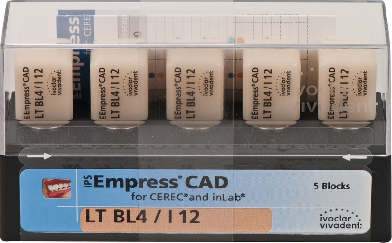 IPS Empress® CAD ist ein leuzitverstärkter Glaskeramik-Block, bestehend aus Glas- und Kristallphasen. Das Material ist seit fast 20 Jahren klinisch erfolgreich und bewährt. Die ästhetischen Eigenschaften der leuzitverstärkten Glaskeramik sind der einer Feldspatkeramik deutlich überlegen. Die geschliffenen Restaurationen weisen gute Passgenauigkeiten und eine homogene Oberfläche auf. Abschließend können die Restaurationen entweder sehr einfach und schnell auf Hochglanz poliert oder mit IPS Empress universal Malfarben bemalt und/oder mit IPS Empress® Esthetic Veneer individuell verblendet werden. IPS Empress® CAD HT (High Translucency). Aufgrund ihrer hohen Transluzenz sind HT-Blocks ideal zur Herstellung von kleoneren Restaurationen (z. B. Inlays und Onlays) geeignet. IPS Empress® CAD LT (Low Translucency). Dank ihres hohen Helligkeitswertes im Vergleich zu den HT-Blocks sind die LT-Blocks ideal zur Herstellung von größeren Restaurationen (z. B. Front- und Seitenzahnkronen) geeignet. IPS Empress® CAD Multi (mehrschichtig). Die Blöcke weisen einen natürlichen Farbverlauf von Dentin zu Schneide auf. Sie sind in den fünf gängisten A-D und 2 Bleach BL-Farben erhältlich. Die Blocks liefern je nach Indikation entweder einen natürlichen Chamäleoneffekt, natürlichen Helligkeitswert oder einen natürlichen Farbverlauf.