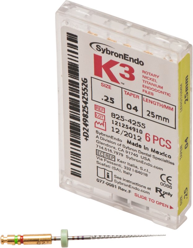 K3 ist ein asymmetrisches, endodontisches Feilensystem der dritten Generation. Entwickelt, um schnell, effizient und sicher Debris zu entfernen. K3 bewältigt technische und verfahrensabhängige Probleme wie keine andere geschliffene Feile. Asymmetrische Schneidewinkel Viele Feilen haben über die gesamte Länge der Feile einen konstanten Winkel (Abstand zwischen den Schneidekanten). Dies kann zu einem „Einschraubeffekt“ führen. Die K3 Feile hat unterschiedliche Schneidewinkel, wodurch Debris effektiv in Richtung koronal transportiert wird. Dies ist nicht nur bei der anfänglichen Reinigung und Aufbereitung wichtig, sondern auch bei Revisionen. Weniger Reibung, mehr Stabilität Die Entlastung der Schneidekante der radialen Phase bei K3 Feilen minimiert den Reibungswiderstand. Andere Nickel-Titan-Systeme haben weite radiale Phasen, die die Reibung verstärken und Brüche auslösen können. K3 Feilen haben zusätzliches Material unter der Schneidefläche, um mehr Unterstützung zu bieten, um Deformationen zu verhindern. Mit anderen Systemen kann es bei der Instrumentierung zum Überdrehen der Schneidekante oder zu Abrissen kommen.