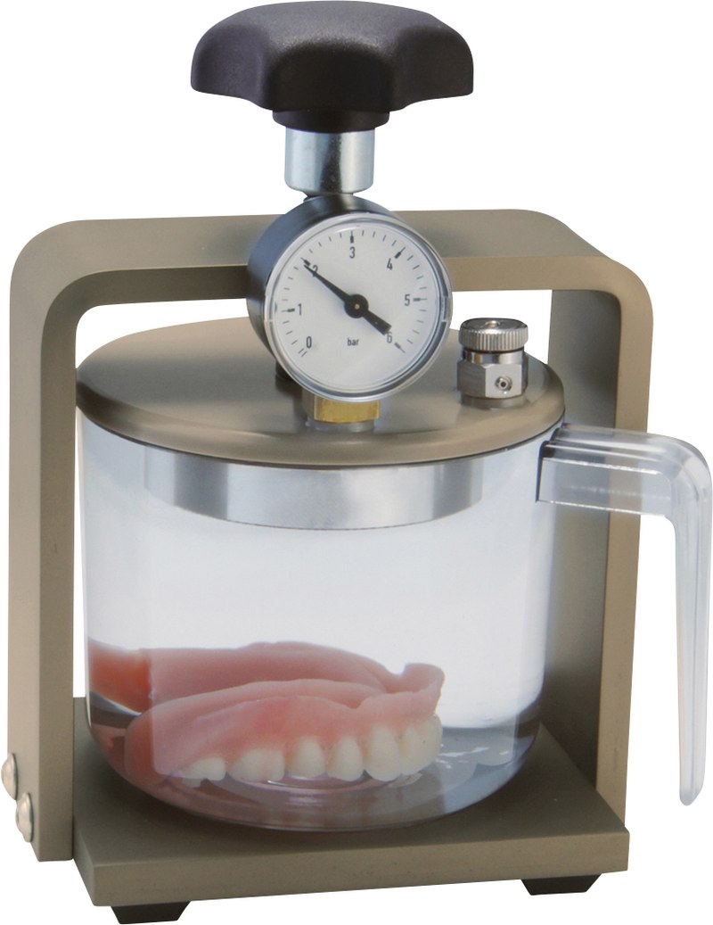 Elektrizitäts- und druckluftunabhängiger Polymerisationstopf aus kompaktem, thermostabilem Kunststoff mit manueller Druckerzeugung durch Wasserkompression über die Drehspindel. Zur Polymerisation aller Kaltpolymerisate bis 50 °C/122 °F (z.B. direkte Unterfütterungen).