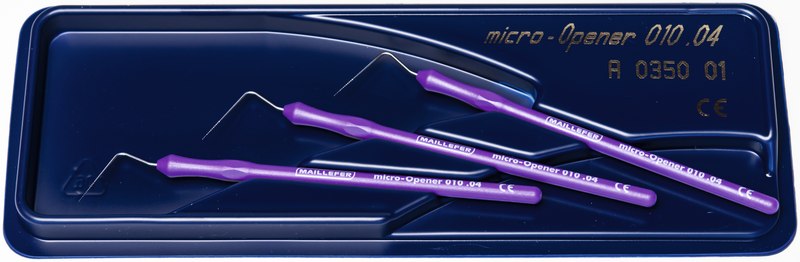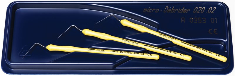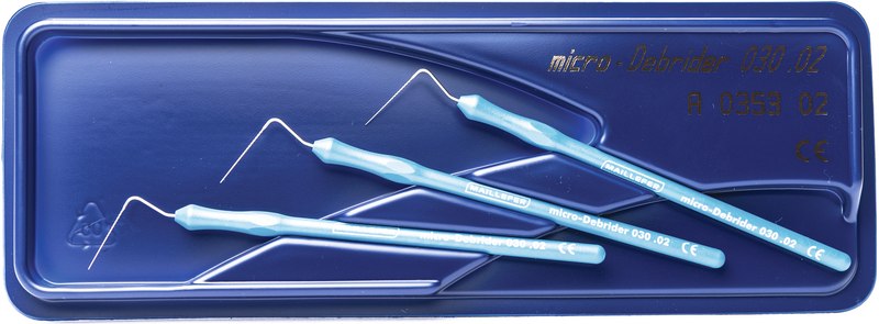 Endodontische Spezialinstrumente für optimale Sicht auf den Operationsraum. Dank des ergonomischen Handgriffs bleibt die Hand des Behandlers außerhalb des Mundes. Besonders geeignet für die Arbeit mit dem OP-Mikroskop. Micro-Opener - Spezial-Feile aus Edelstahl mit zierlichem ergonomischem Griff, erhältlich in den Konizitäten 4 % oder 6 %, Länge 17 mm. Für die Lokalisierung und den erleichterten Zugang zu den Wurzelkanälen. Micro-Debrider - Spezial-Hedstroemfeile aus Edelstahl mit zierlichem ergonomischem Griff, Konizität 2 %, Länge 16 mm. Für die Entfernung von Gewebe, Guttapercha etc.