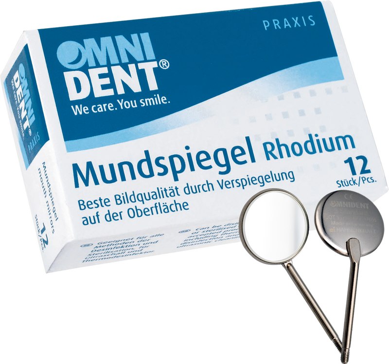OMNIDENT Mundspiegel Standard: Spezielle Silber-Titan-Beschichtung für extrem lange Haltbarkeit. Hohe Reflektion für beste Spiegelqualität. Aus rostfreiem Edelstahl. Sterilisierbar und desinfizierbar. OMNIDENT Mundspiegel Rhodium: Absolut scharfes Spiegelbild und somit beste Bildqualität durch Oberflächen- Versiegelung, da die Reflektion/Spiegelung direkt auf der Oberfläche stattfindet. Aus rostfreiem Edelstahl. Sterilisierbar und desinfizierbar. Rhodium als Edelmetall ist resistent auch gegenüber säurehaltigen Lösungen (z. B. Neodisher N).