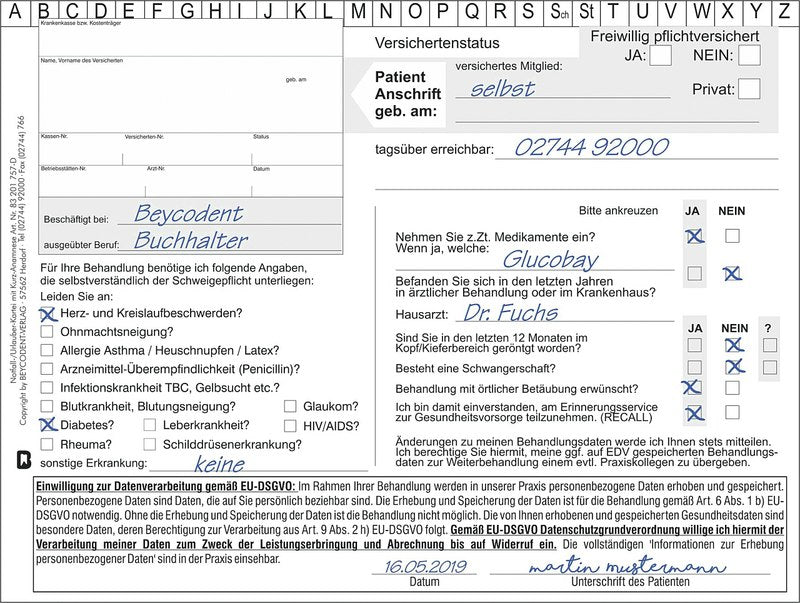 - DSGVO-Konformität: Jedes Formular enthält ein spezielles Feld für die Einwilligung zur Datenverarbeitung gemäß der Datenschutz-Grundverordnung (DSGVO), um die Sicherheit und Vertraulichkeit der Patientendaten zu gewährleisten