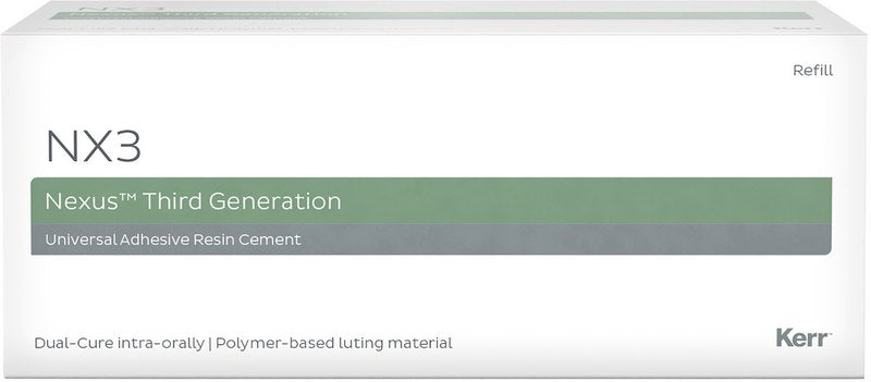 Die neue Generation des adhäsiven Befestigungszements NX3 ist sowohl mit „Total-Etch“ als auch mit „Self-Etch“ Adhäsiven kompatibel. NX3 zeichnet sich durch hervorragende Farbstabilität, hohe Transluzenz und hervorragende Haftkraft aus. NX3 ist für zeitaufwendige Restaurationen als lichthärtender Zement in der Standard Spritze erhältlich. Zusätzlich wird NX3 in der praktischen Automixspritze als dualhärtender Zement angeboten, wodurch die Verwendung eines Aktivators bei Indikationen mit geringer oder ohne Lichteinwirkung entfällt. Die Röntgenopazität liegt bei über 330 %.