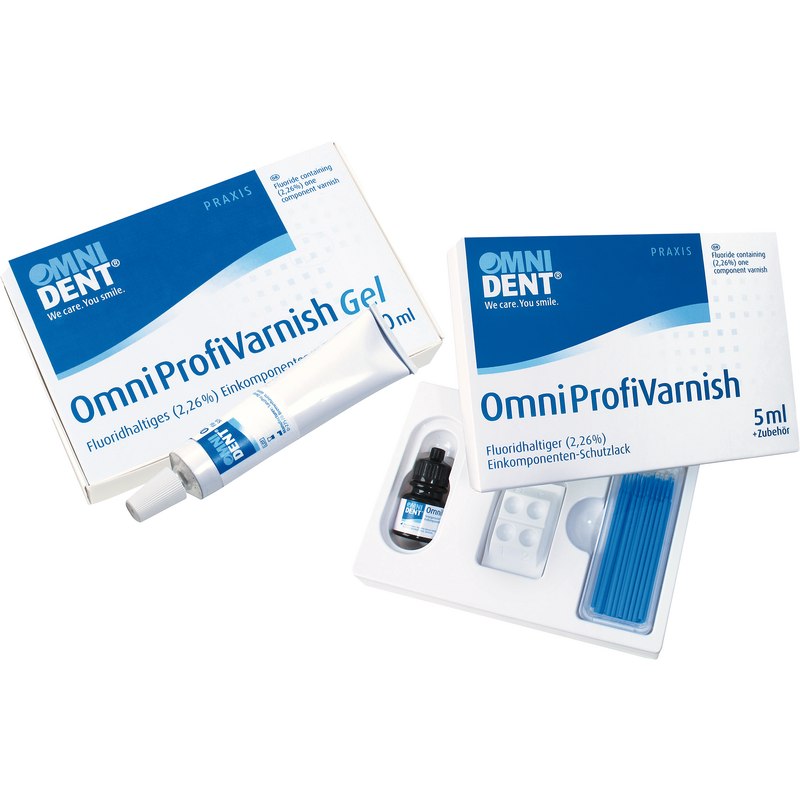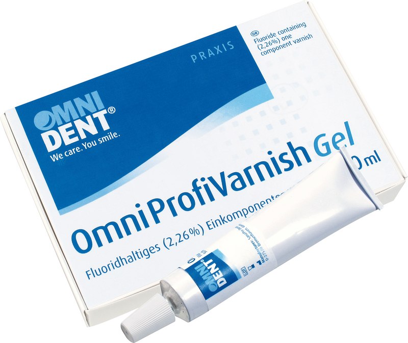 Das Omni ProfiVarnish ist ein fluoridhaltiger Einkomponenten-Schutzlack bzw. –gel, das zur Desensibilisierung von Zähnen auf Schmelz- und Dentinoberflächen aufgetragen wird. Zur Behandlung von hypersensiblen Zähnen, freiliegenden Zahnhälsen und Zahnöberflächen während und/oder nach der kieferorthopädischen Behandlung. Omni ProfiVarnish enthält neben leicht löslichen Fluoriden zusätzlich Calciumfluorid und Fluorapatit, welches die Remineralisierung von der Zahnsubstanz unterstützt. Omni ProfiVarnish enthält 22.600 ppm (2,26 %) Fluoride.
