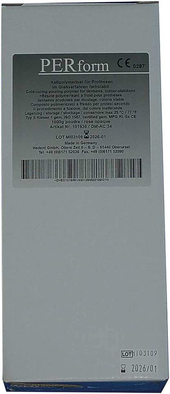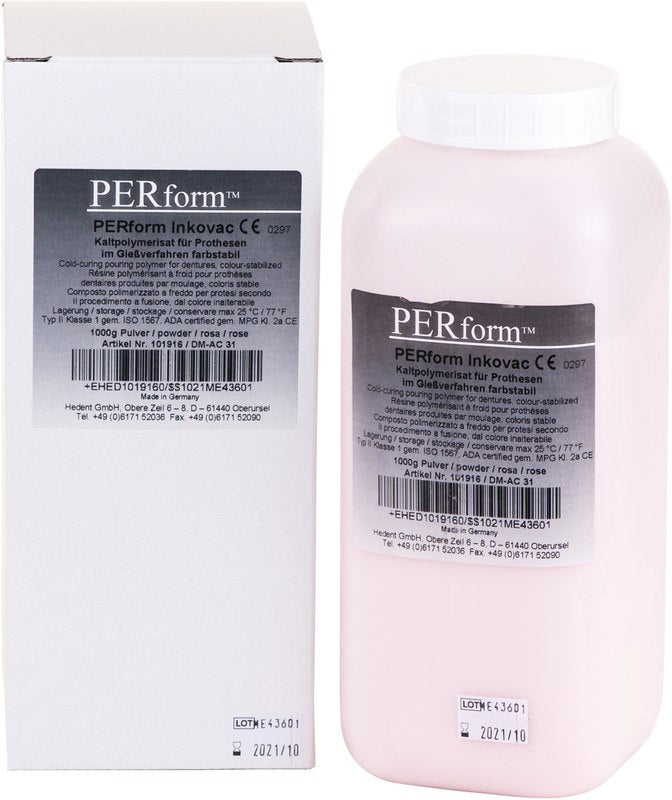Kunststoff-Warmpolymerisat für Prothesen im Perform-Inkovac-Polymerisationssystem und in der Modellgusstechnik. Perform Kunststoff ist speziell für die Gießtechnik entwickelt worden und zeichnet sich durch besonders gute Fließeigenschaften aus. Es ist ein farbstabiles Polymethymetacrylat mit Barbitursäure-Katalysatorsystem. Restmonomer unter 1 %.
