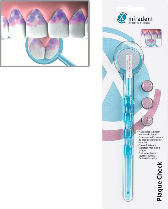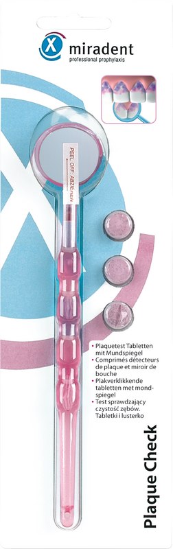 Plaquetest-Tabletten mit Mundspiegel. Der miradent Mundspiegel mit dem Fingerform-Griff ist abgewinkelt, besonders flach und zeigt so jedes Detail im Mundraum. Ideal zur Kontrolle der Plaqueeinfärbungen. Der kristallklare Spiegel ist durch eine Folie geschützt, die vor dem Einsatz zu entfernen ist.