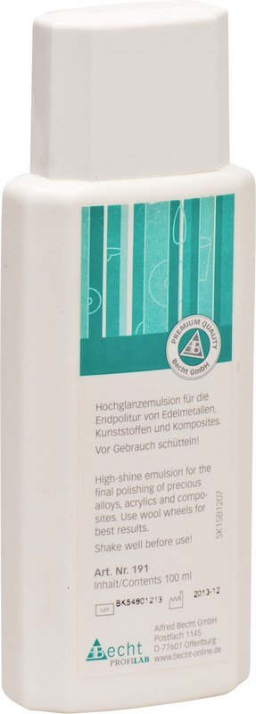 Gebrauchsfertige Emulsion für die Hochglanzpolitur. Breites Anwendungsspektrum auf Kunststoffen, Edelmetallen und Composites. Alternative zu Büdopolit oder Sidol. Cremige Konsistenz erhöht dieHaftung am Polierkörper. Beste Polierergebnisse werden mit Wollrädern, REF 292.1 erzielt. Mit frischem Duft, hautfreundlich, ungiftig und ergiebig.