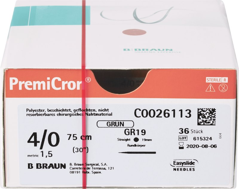 PremiCron® ist ein nicht resorbierbares, geflochtenes, aus Polyester bestehendes Nahtmaterial mit einer Silikonbeschichtung.