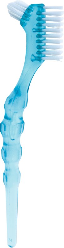 Prothesenbürste mit zwei Bürstenköpfen: großes Borstenfeld zur Reinigung der Außenseiten, kleinerer Kopf zur Reinigung der Protheseninnenseiten. Ergonomisch geformter Fingerformgriff.