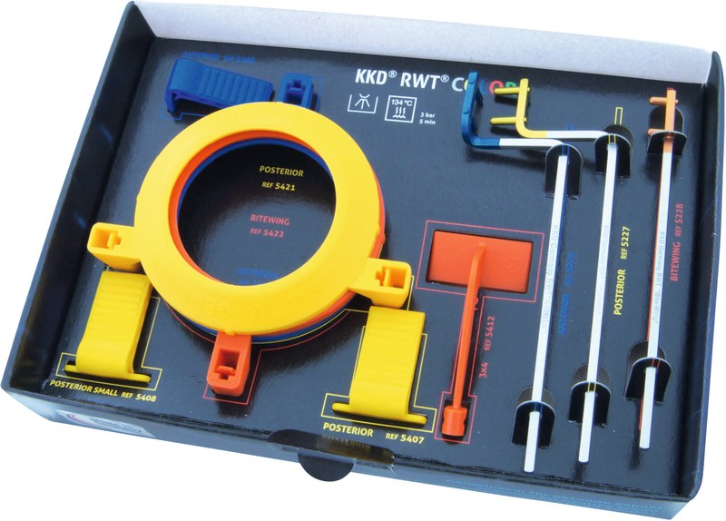 Die RWT® Bißplatten (Anterior, Posterior und Posterior small) sind anwenderfreundlich auf der Rückseite des Halteschilds mit der Größenangabe der zu verwendenden Speicherfolien und Röntgenfilme versehen und für den jeweiligen Anwendungsbereich farbcodiert.