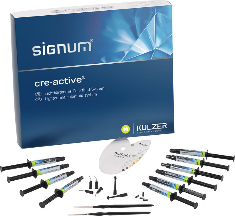 Mit unseren Signum cre-active® Malfarben erzielen Sie individuelle Charakterisierungen. Das vielfältige Farbangebot der Signum cre-active Colorfluids erlaubt Ihnen, Restaurationen perfekt an die Nachbarzähne anzugleichen. Die Colorfluids werden direkt auf die ausgehärtete Kompositoberfläche aufgetragen und polymerisiert. Signum cre-active ist das Kreativmodul zum Charakterisieren und hilft Ihnen beim Einlegen von markanten Details wie Kalkflecken, Schmelzrissen, Alterungen oder Abrasionseffekten. Signum cre-active® rundet die Verarbeitung mit den Signum Verblendmaterialien Signum composite, Signum ceramis und Signum matrix kompatibel ab. Modifikationen von Prothesenzähnen sind ebenfalls möglich.