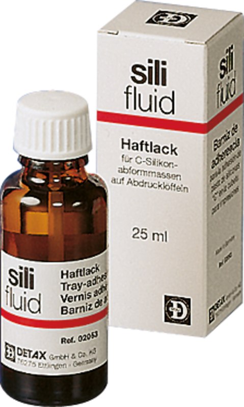 sili Haftlack zur Haftung von kondensationsvernetzenden Abformmassen auf Kunststoff-, Metall und individuellen Löffeln. Farbe blau-transparent. sili Haftlöser Zum Entfernen des Haftlackfilms und Reinigen des Abdrucklöffels nach der Abdrucknahme.