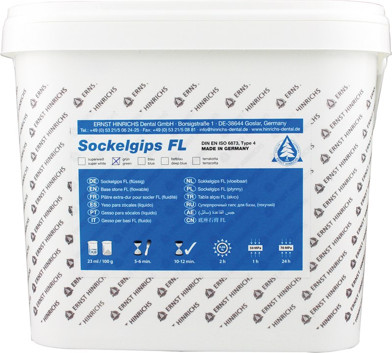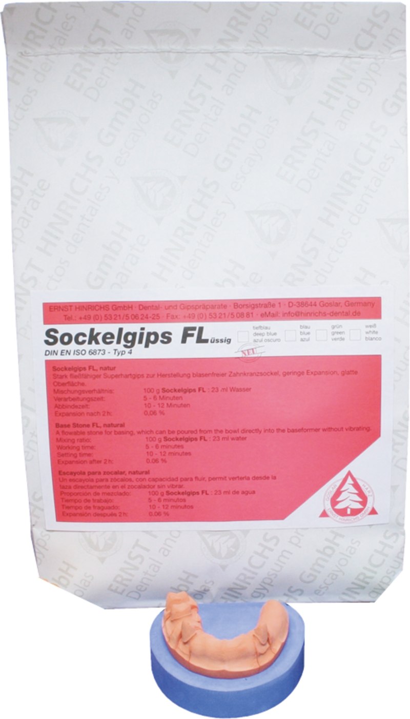 Ein fließfähiger Sockelgips, der aus dem Becher ohne zu vibrieren direkt in den Sockelformer gegossen werden kann. Sockelgips flüssig ist zum Sockeln aller Stumpf- und Zahnkranzarbeiten geeignet. Typ 4.