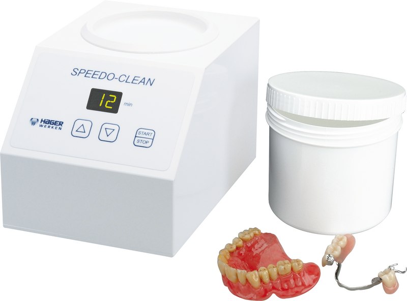 Geräuschearmes Prothesenreinigungsgerät. Ästhetische Oberflächenreinigung unter Einsatz von rotierenden Poliernadeln in Verbindung mit einer Reinigungsflüssigkeit - ohne Materialabrieb.