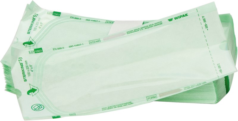 Sterilgutverpackung für die Dampf- und Gassterilisation. Medizinisches Spezialpapier. 9-schichtige Kunststoff-Folie für höchste Reißfestigkeit. Beim Versiegeln verfärbt sich die grüne Folie dunkler. Als Siegeltemperatur werden je nach Druck und Zeit 165 - 200 °C empfohlen.
