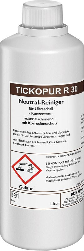 Zur besonders schonenden Reinigung und Entfettung von zerlegten und unzerlegten Maschinen, Werkzeug-, Glas- und Keramikteilen in Industrie, Handwerk und Laboratorien. TICKOPUR R 30 ist speziell für die Reinigung in SONOREX-Ultraschallgeräten, aber auch zur Tauch-, Wisch und Hochdruckreinigung einzusetzen. Bei sachgemäßer Anwendung wird eine schnelle und materialschonende Reinigung gewährleistet.