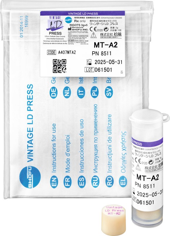 Die VINTAGE LD Press Rohlinge aus Lithiumdisilikat, die über eine hohe Stabilität und Strapazierfähigkeit verfügen, sind in vier unterschiedlichen Transluzenzen erhältlich. Diese Auswahl bietet uneingeschränkte Möglichkeiten zur Herstellung von ästhetisch hochwertigen und hochstabilen Kronen, Veneers, Inlays / Onlays sowie dreigliedrigen Frontzahnbrücken. Die Lithiumdisilikat-Glaskeramik erreicht aufgrund der Zusammensetzung und der nadelförmigen, verflochtenen kristallinen Struktur eine extrem hohe Rissbeständigkeit und mechanische Festigkeit von bis zu 400 MPa.
