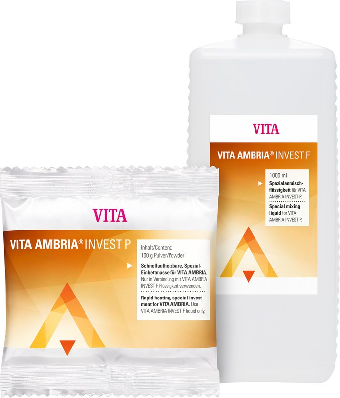 Ideal auf VITA AMBRIA Pressrohlinge abgestimmte, phosphatgebundene und speedfähige Einbettmasse mit Flüssigkeit für eine exakte Expansionssteuerung und Fließfähigkeit.