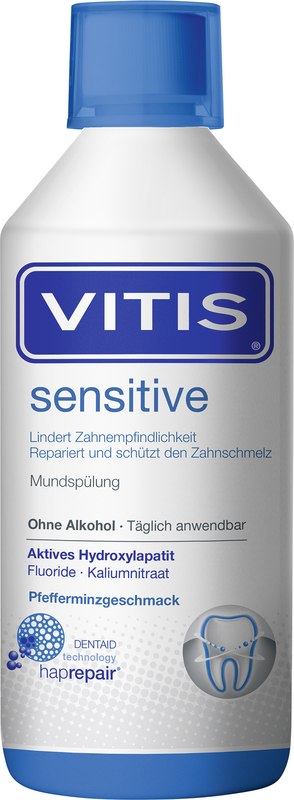 Die VITIS® sensitive Mundspülung für die tägliche Pflege lindert Zahnempfindlichkeit, repariert und schützt den Zahnschmelz dank der einzigartigen und innovativen Haprepair-Technologie. Beugt Karies vor und schützt Zahnschmelz, Zahnfleisch und Zahnfleischgewebe.