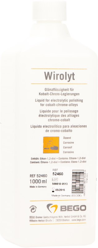 Flüssigkeit zum elektrolytischen Glänzen von Kobalt-Chrom-Legierungen. Wirolyt ist für BEGO Eltropol und Glänzgeräte anderer Hersteller gleichgut geeignet und sichert stets den optimalen Glanzeffekt.