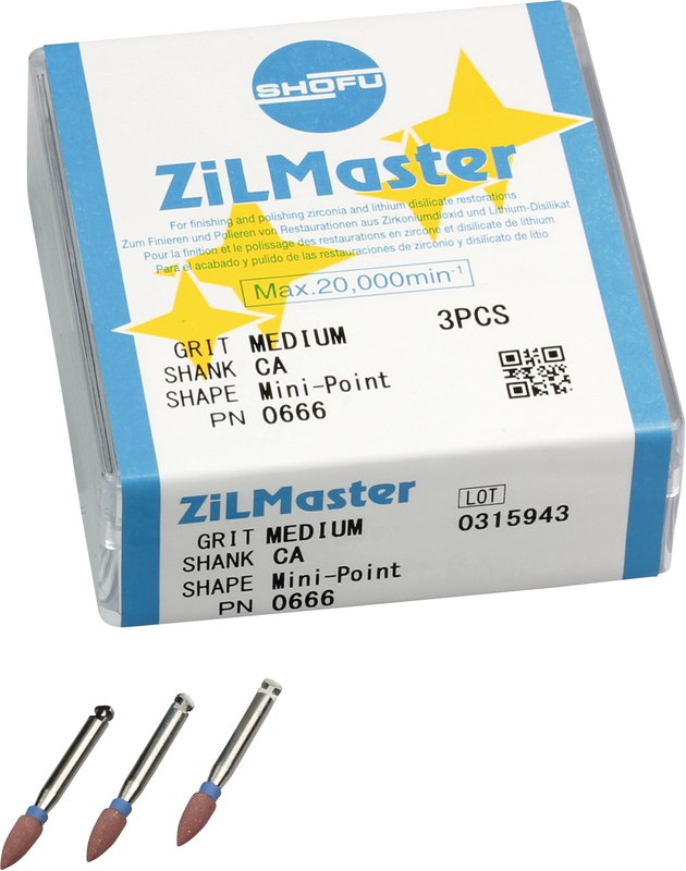 Das Drei-Schritt-Poliersystem mit diamantierten Instrumenten glättet die Restaurationen, entfernt beim Konturieren entstandene oberfächliche Kratzer und poliert auf Hochglanz. ZiLMaster ist in verschiedenen Formen und Schafttypen zur extra- und intraoralen Anwendung erhältlich. Systematische Politur von Restaurationen aus Zirkoniumdioxid und Lithiumdisilikat: